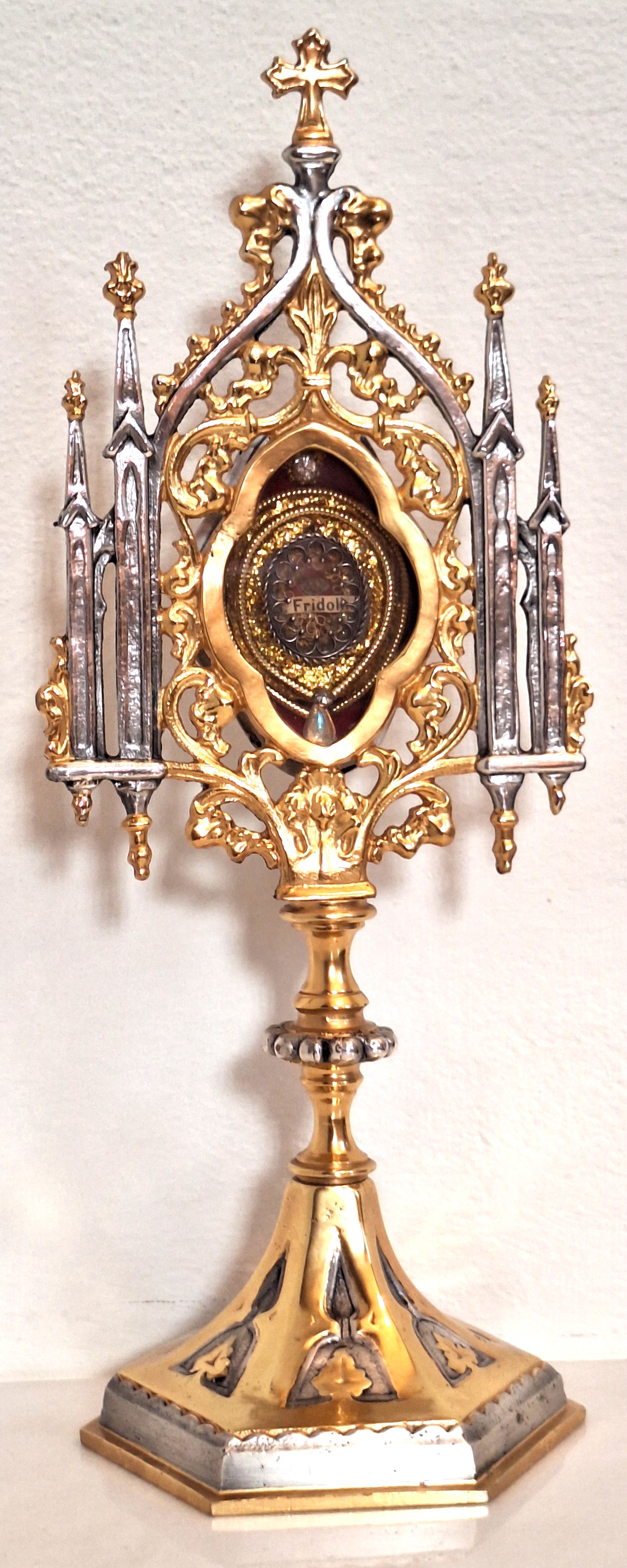 Das Fest des hl. Fridolin wird am 6. März gefeiert. Er stammte einer Lebensbeschreibung des 10. Jahrhunderts nach aus Irland und war zuerst als Glaubensbote in Gallien tätig, wo er die in der Völkerwanderung verwüstete Grabstätte des hl. Hilarius von Poitiers wiedererrichtete und den Kult des Heiligen entlang der Mosel und rheinaufwärts verbreitete. Der Name des hl. Hilarius versteckt sich in den Gründungen Fridolins wie Eller (bei Cochem) und Glarus. Auf der Rheininsel Säckingen östlich von Basel erbaute Fridolin, der „Apostel des badischen Oberlandes“, ein Doppelkloster, das älteste Kloster Süddeutschlands, von dem die Missionierung des heutigen Baden-Württemberg ausging. Seine Gebeine ruhen bis heute in der Stiftskirche von Säckingen, dem sogenannten Fridolinsmünster, in einem Silberschrein. Weitere Reliquien befinden sich im Wiener Stephansdom. Am 22. Mai 2011 vermachte Erzbischof Wolfgang Haas anlässlich der Feier zum 100. Weihejubiläum der Pfarrkirche (11. Mai 1911) der Pfarrei St. Fridolin für ein Reliquiar eine Reliquie des hl. Fridolin von Säckingen. Gemäss einer Ergänzung aus dem 13. Jahrhundert zur oben erwähnten Lebensbeschreibung habe Fridolin von dem sterbenden, reichen Ursus oder Urso grosse Teile des Glarnerlandes geschenkt bekommen, was dessen Bruder Landolf aber nicht anerkennen wollte. Fridolin habe deshalb Ursus als Zeugen aus dem Grab zu Hilfe geholt. Landolf sei, als er seinen bereits in Verwesung übergegangenen Bruder vor Gericht erscheinen sah, so erschrocken und beschämt gewesen, dass er Fridolin auch seinen Teil des Glarnerlandes schenkte, das auf diese Weise vollständig an das Kloster Säckingen gelangte. So wurde Fridolin zum Schutzpatron des Kantons Glarus (Schweiz), in dessen Wappen er als Missionar mit Wanderstab und Bibel zu sehen ist. In kirchlichen Darstellungen wird Fridolin mit Bezug auf diese Erzählung auch oft zusammen mit einem Skelett dargestellt, so auf dem Pfarrsiegel der Pfarrei St. Fridolin zu Ruggell.